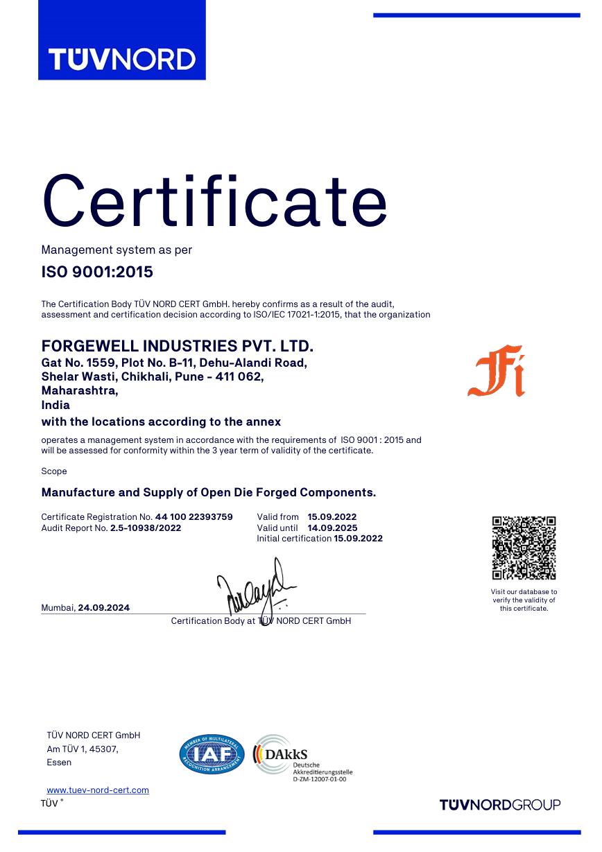’We at FORGEWELL INDUSTRIES PVT. LTD. are committed to Manufacture Open Die Forged Components to meet the customer expectations by maintaining Quality, on time delivery and fulfilling applicable requirements. Which is achieved by nurturing the work culture of Team Work, Innovation, Optimum Utilization of Resources and Continually Improving the Effectiveness of the Quality Management System”
